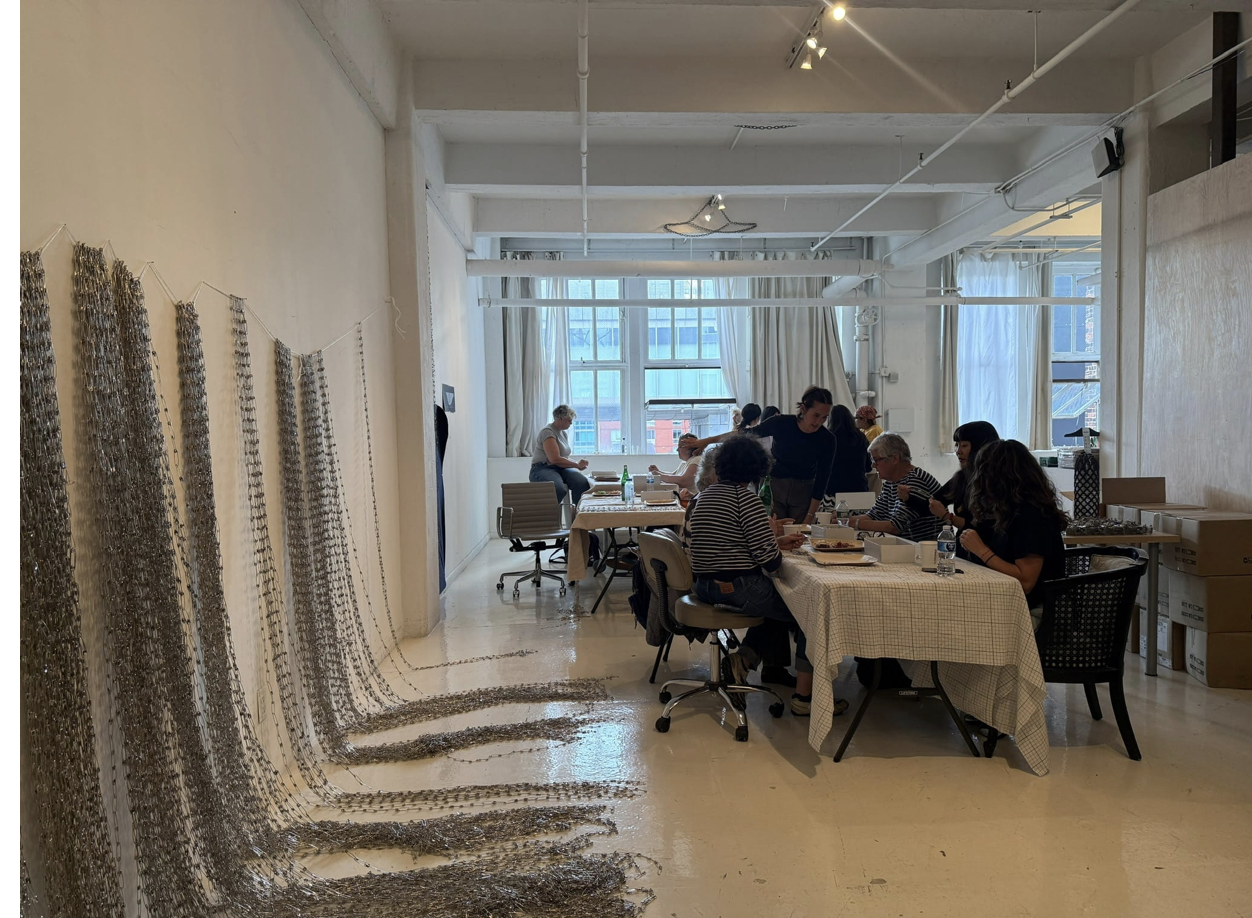 Tamiko Kawata’s workshop with volunteers creating chains of safety pins. (Photo courtesy of Alison Bradley Projects)